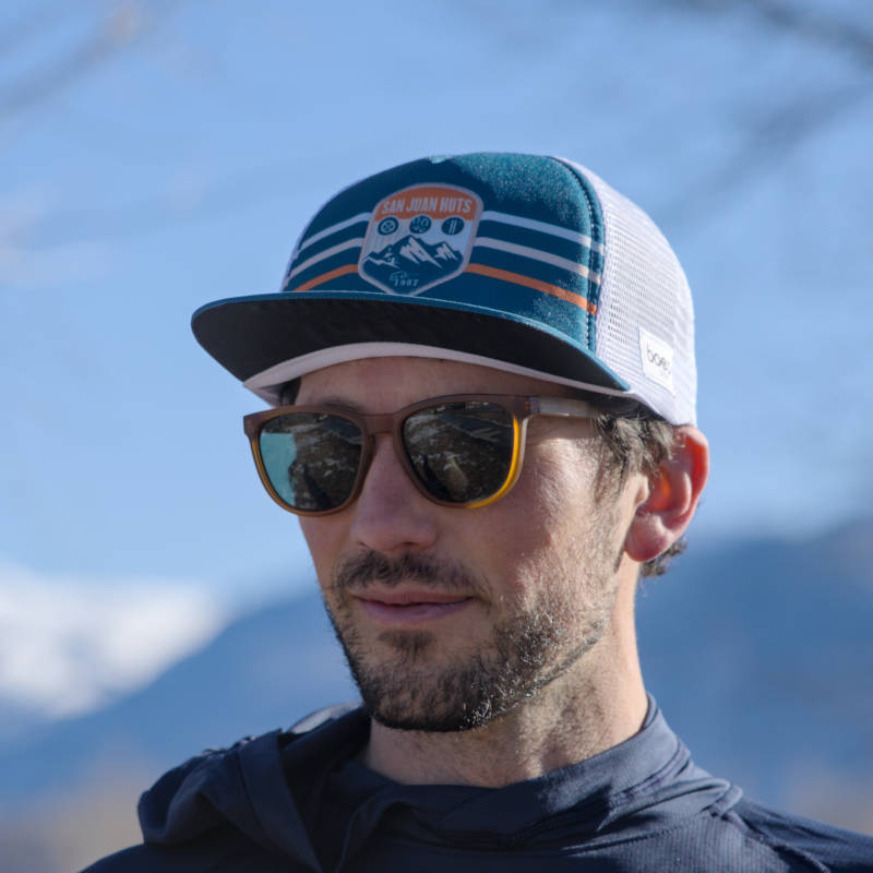 San Juan Huts Arch Trucker Hat – Blue and White Stripes